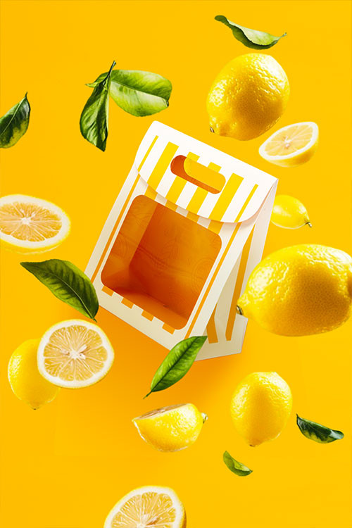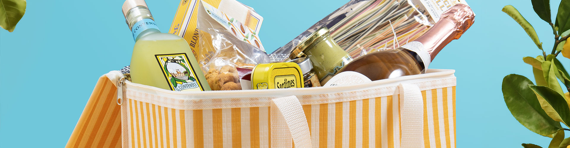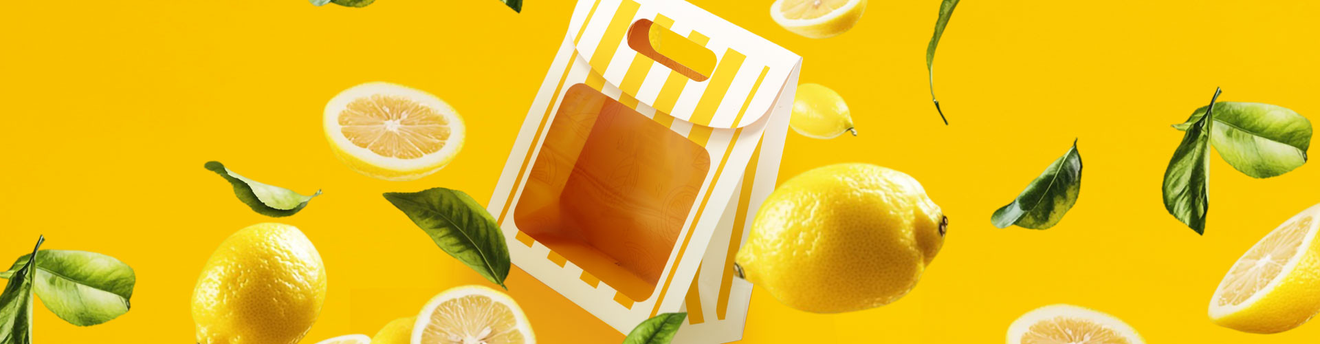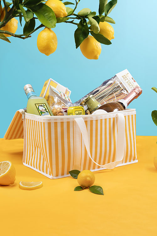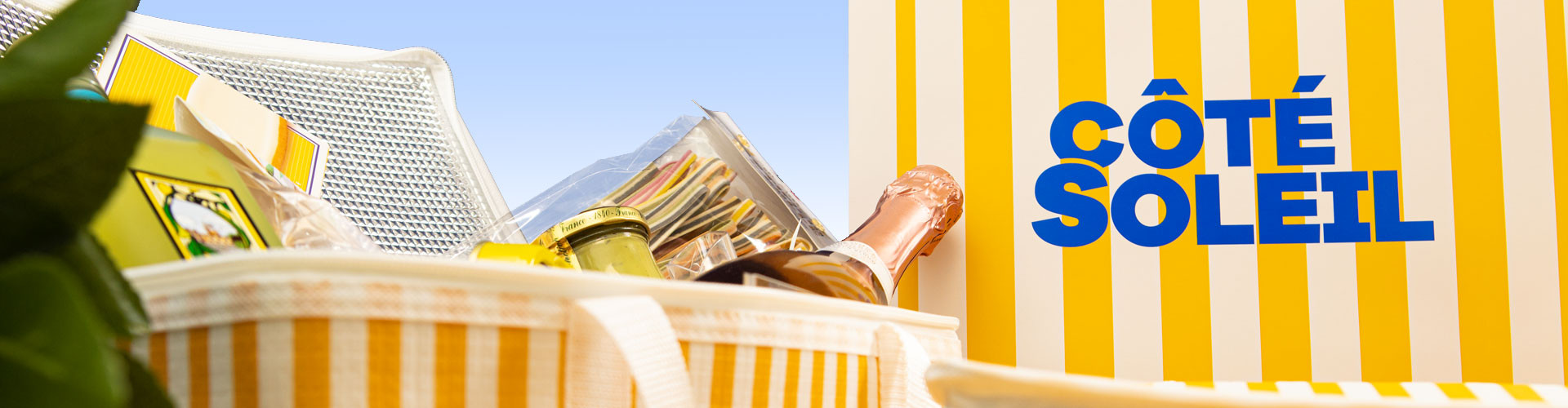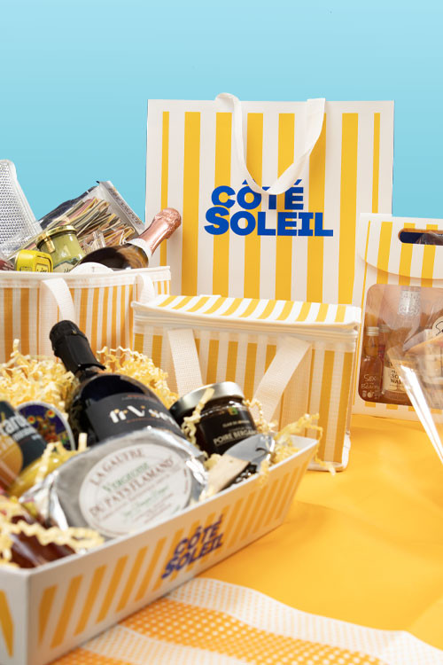 Sac luxe carton rectangulaire, rayé blanc et jaune, anses tissu – Côté Soleil – 36 x 12 x 32 cm